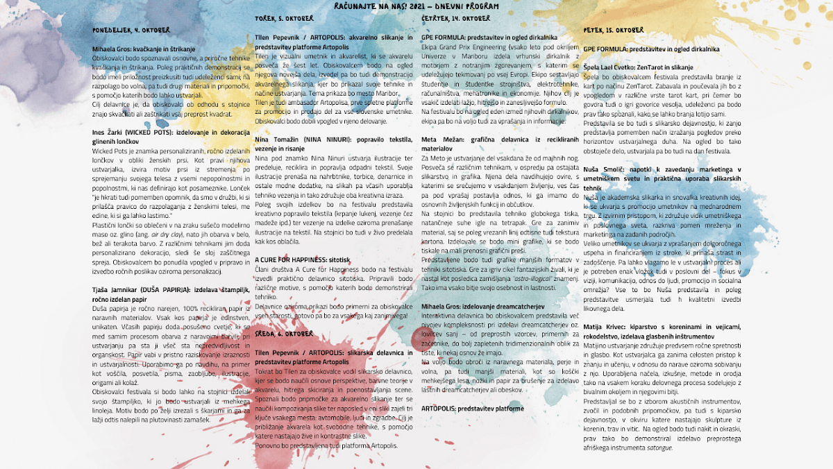 Vabimo vas, da se nam pridružite na drugem delu festivala Računajte na nas! v četrtek, 14. 10. in petek, 15. 10., med 9. in 14. uro na mariborskem Trgu svobode.